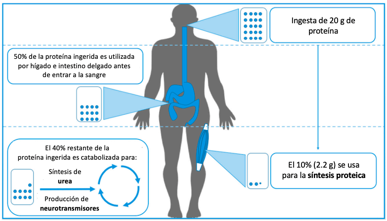 Por ejemplo, si consumes 20 gramos de proteína, los enterocitos (las células del intestino delgado) y el hígado ya van a consumir juntos la mitad (10 g) de esa dosis ingerida. Esto es porque estos dos órganos tienen prácticamente los tejidos más activos metabólicamente del cuerpo.