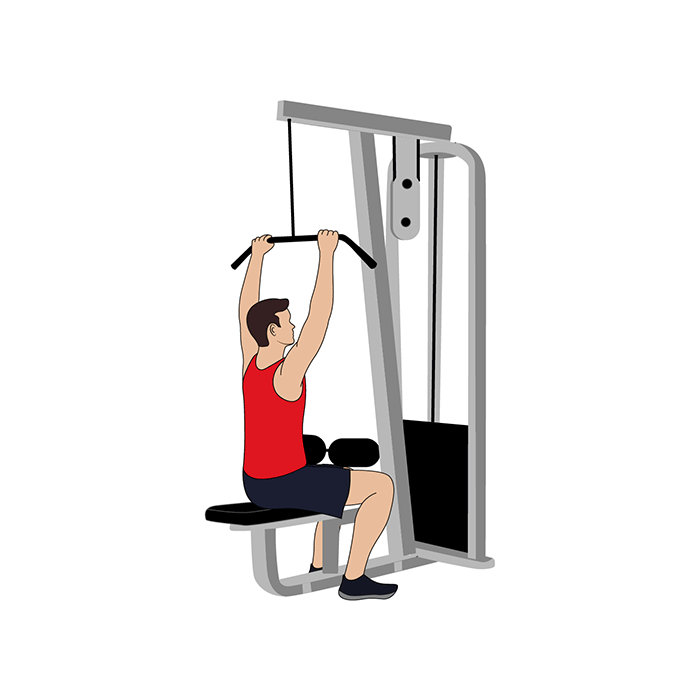 Siéntate recto o ligeramente inclinado hacia atrás y mantén tu pecho elevado mientras traccionas la barra hacia abajo. Mantén tu columna vertebral neutra para evitar padecer dolor lumbar.